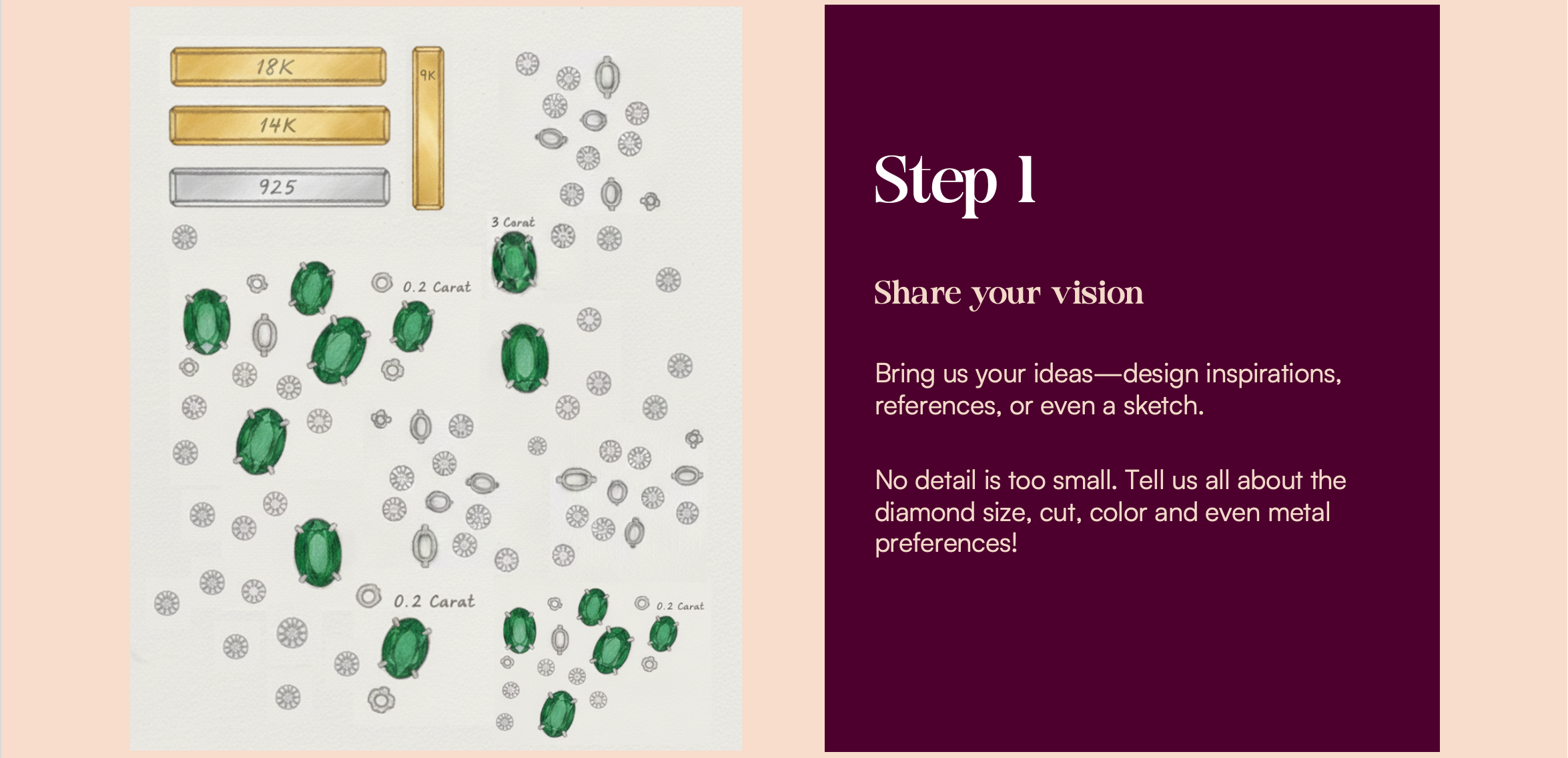 We have experience in working with 9K Gold, 14K Gold, 18K Gold, 22K Gold, Sterling (925) Silver, Lab grown diamonds, Lab grown polki and colored gemstones. If you have a special request, we’ll be happy to look into it for you!