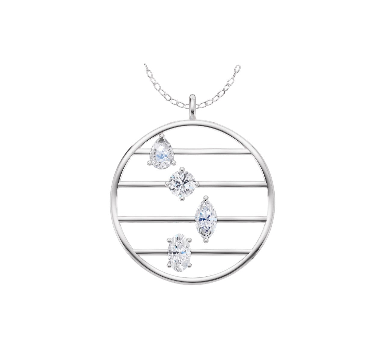 A vertical sparkle party, happening right on your neck. Features marquise, round, oval and pear cut diamonds.