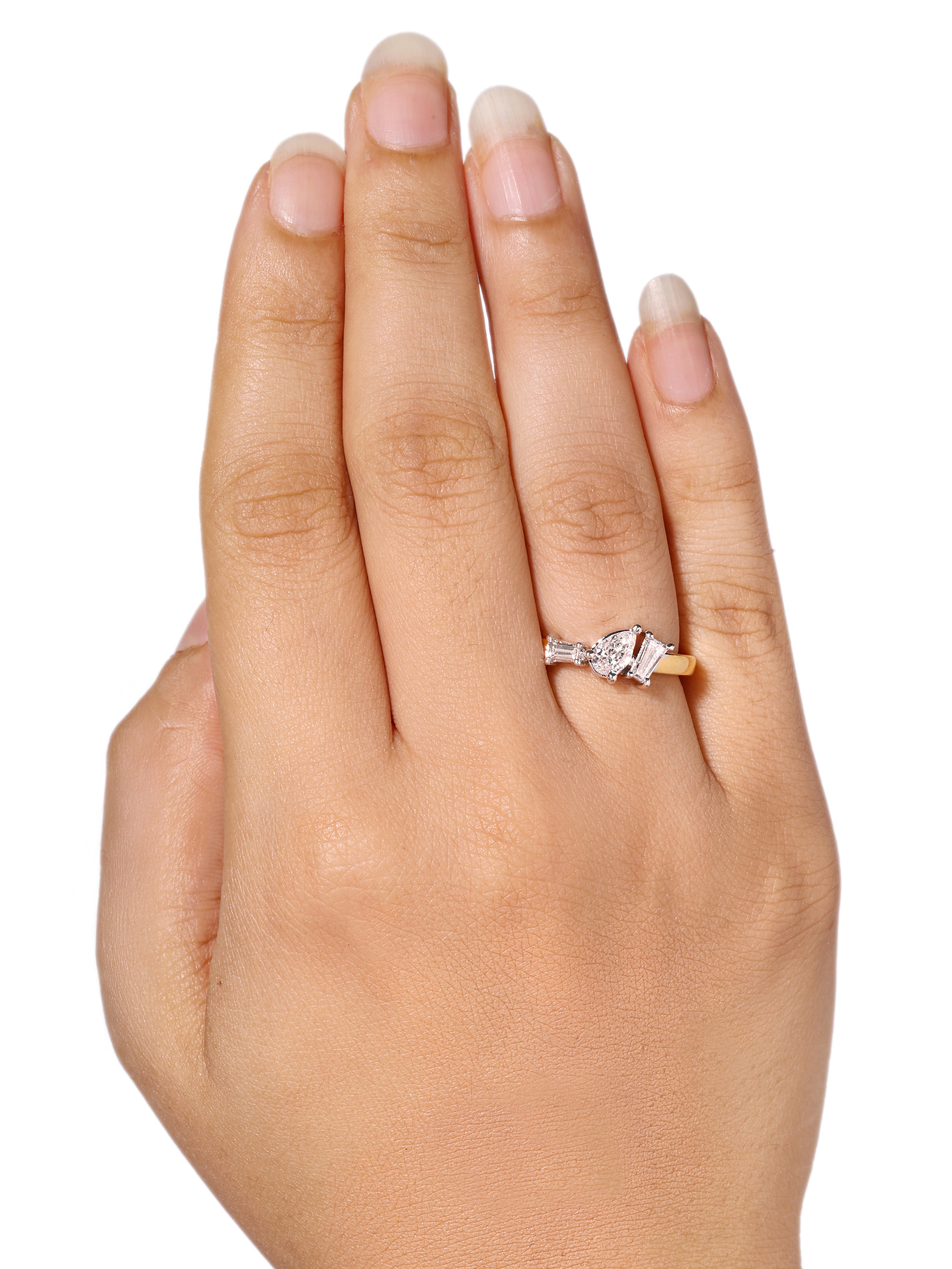 Three's a crowd? More like a dazzling celebration. Features pear, tapered and baguette cut diamonds.